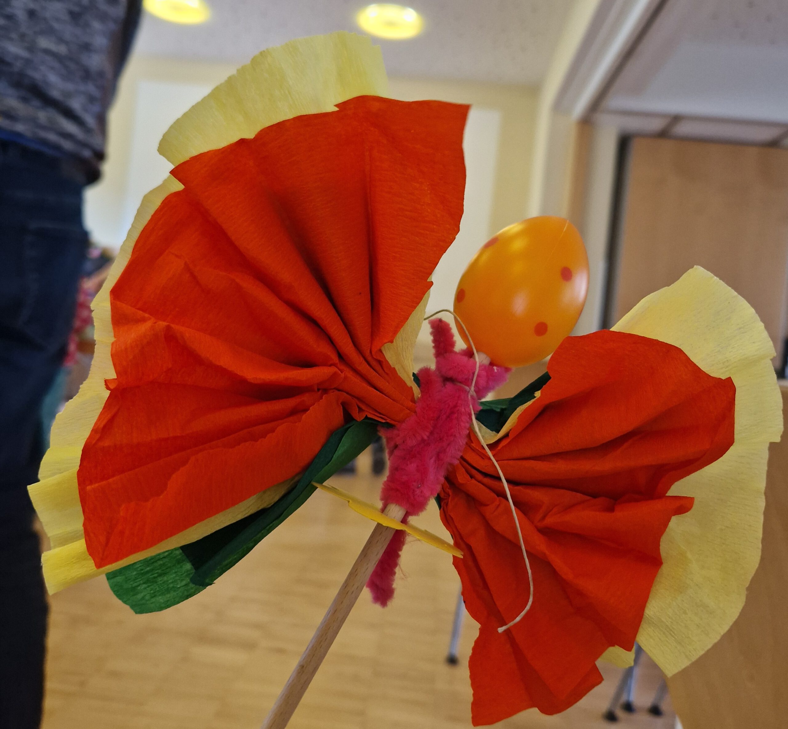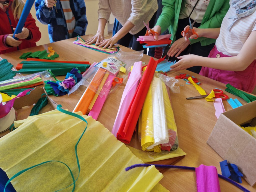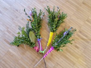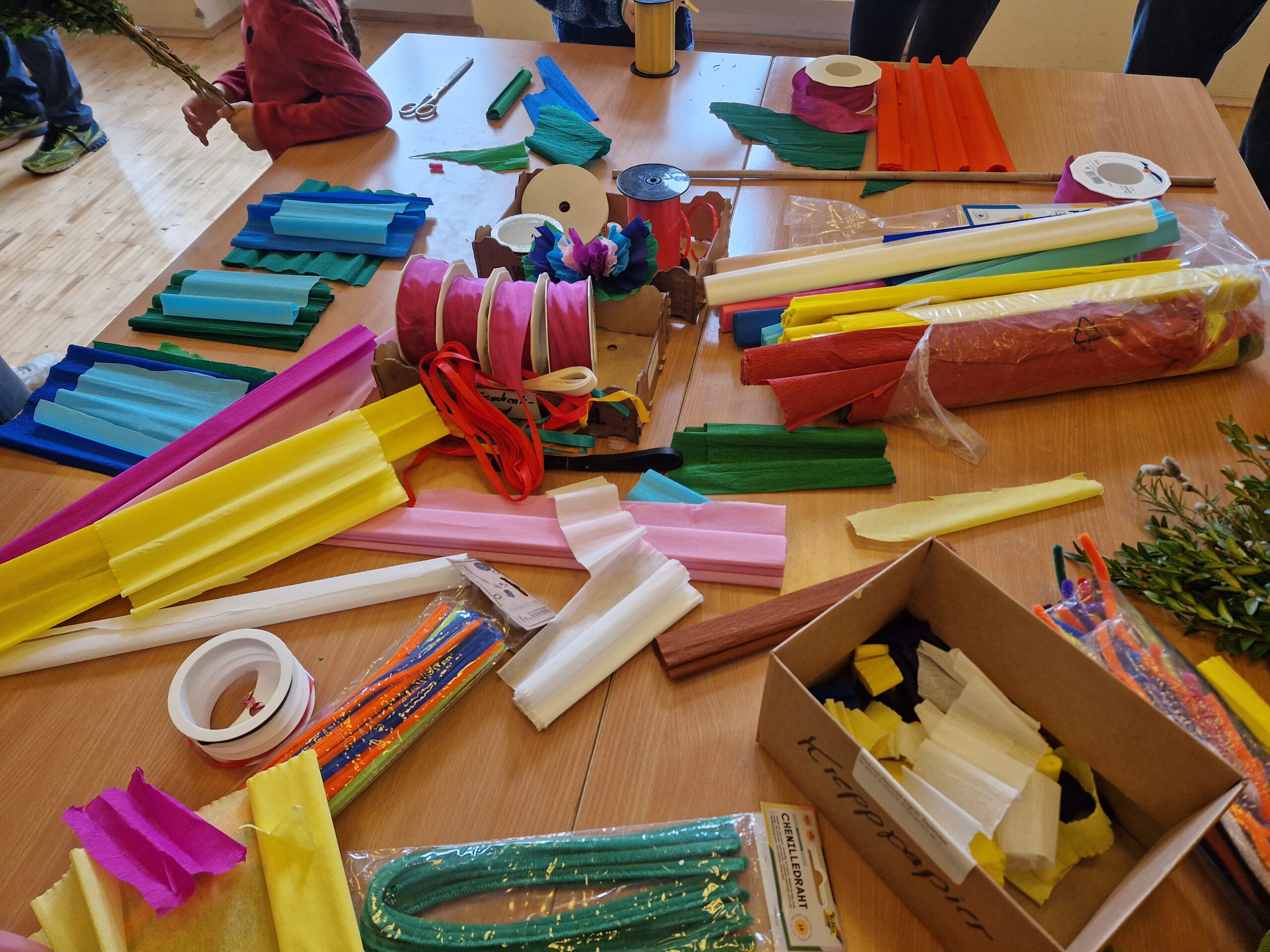 In Vorbereitung auf den Palmsonntag trafen sich die Kinder unserer Pfarrei wieder zum traditionellen Palmwedel-Basteln. Nach einer thematischen Einstimmung, bei der wir eine Geschichte über Simon hörten, ging es mit großem Eifer los: grüne Zweige wurden an Stäbe mit Ostereiern gebunden und mit bunten Bändern, Krepppapierblumen und Schmetterlingen verziert.