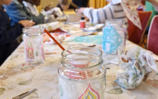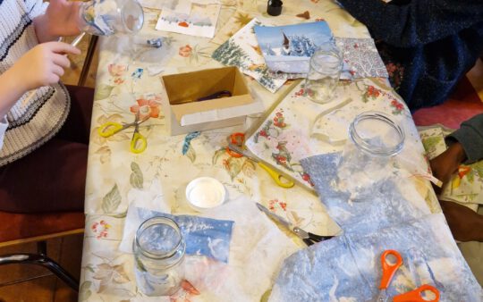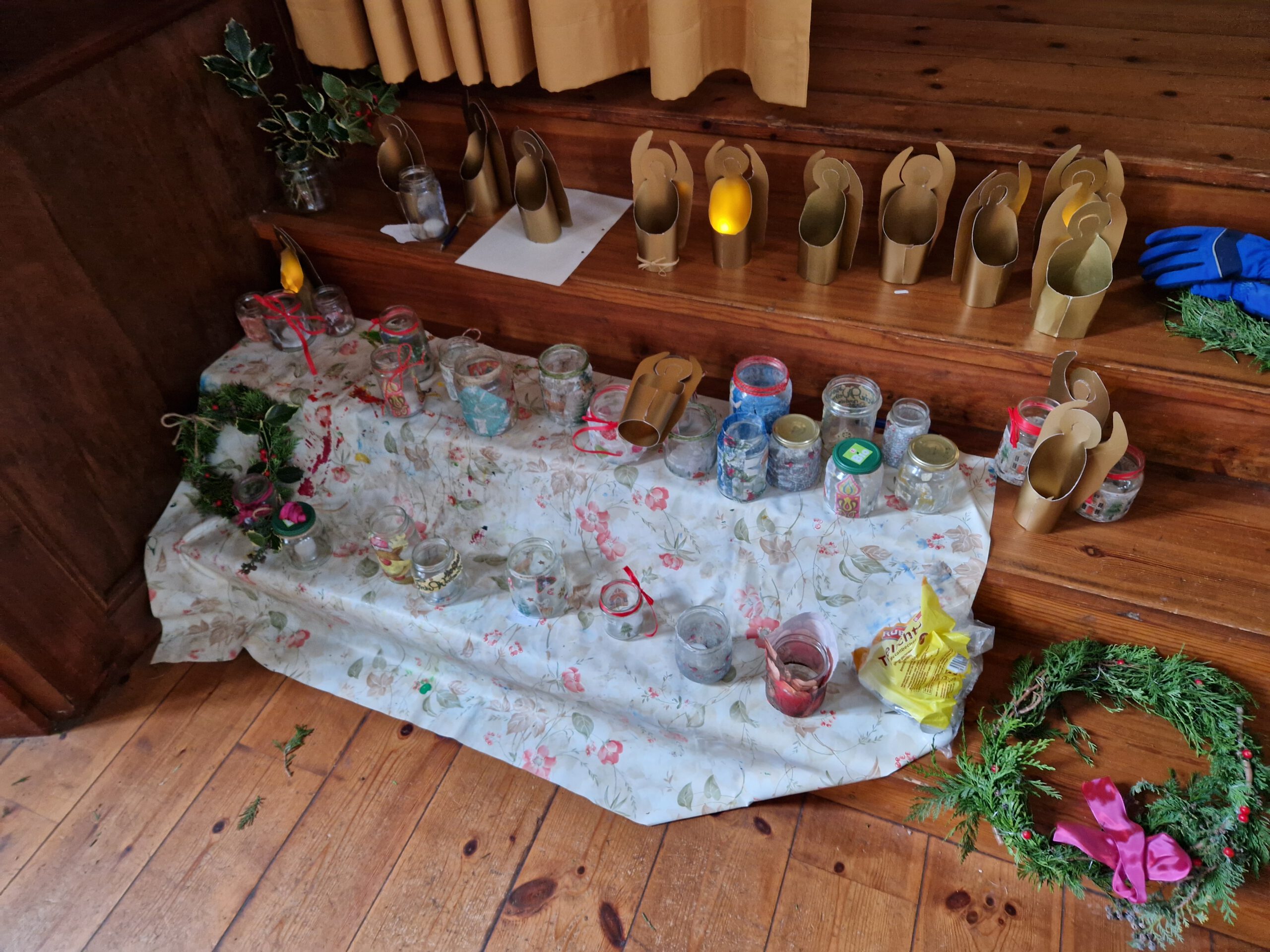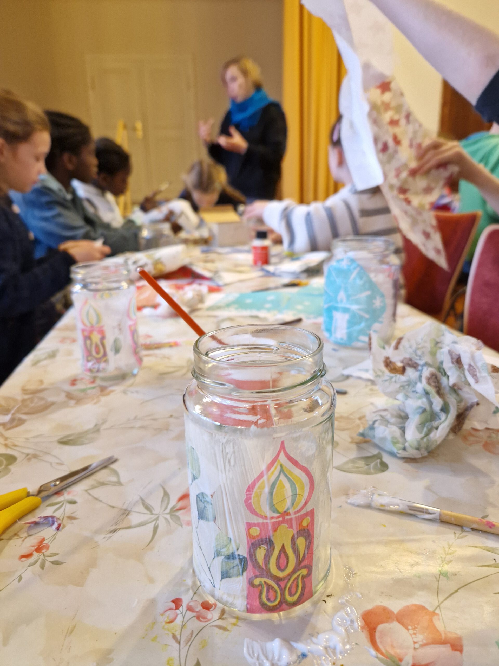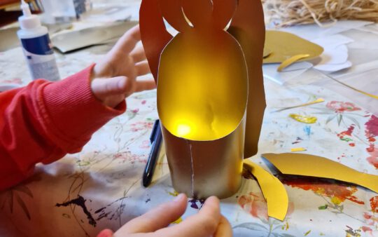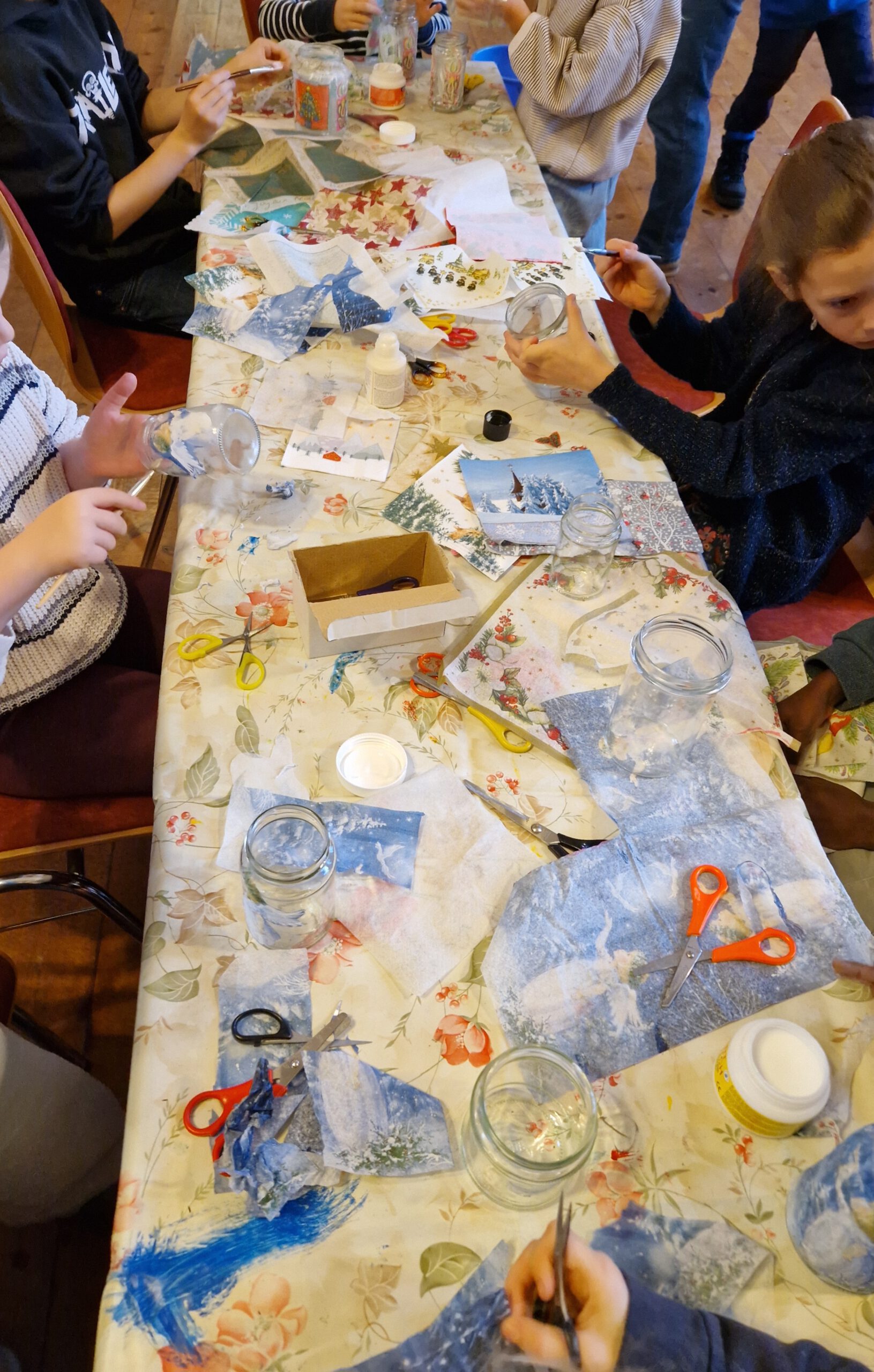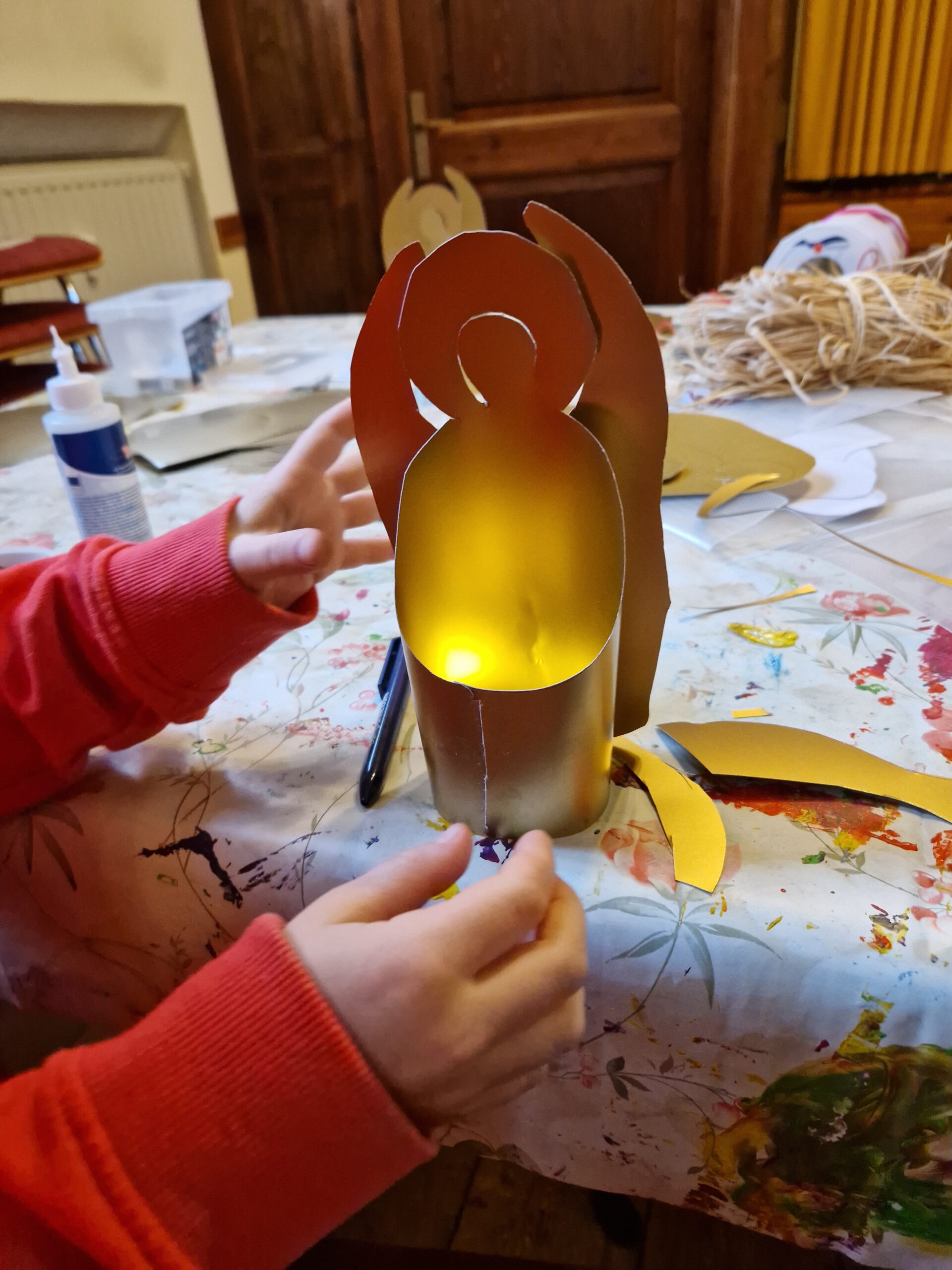 Danach wurde gebastelt, z.B. Engel aus goldenem Karton, die – mit einem Licht versehen – wunderbar leuchten. Auch Windlichter mit Serviettentechnik konnten gestaltet werden. Mit den vorhandenen Zweigen gestalteten die Kinder Kränze und Gebinde.