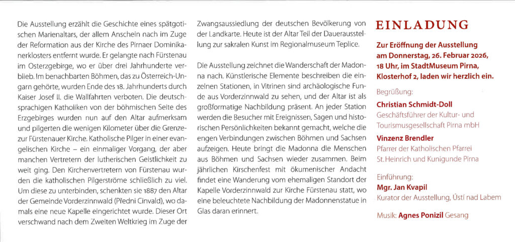 Zur Eröffnung der Ausstellung am Donnerstag, 26. Februar 26, 18 Uhr, im StadtMuseum Pirna, Klosterhof 2, sind alle herzlich eingeladen. Zur Begrüßung wird auch Pfarrer Brendler vor Ort sein.